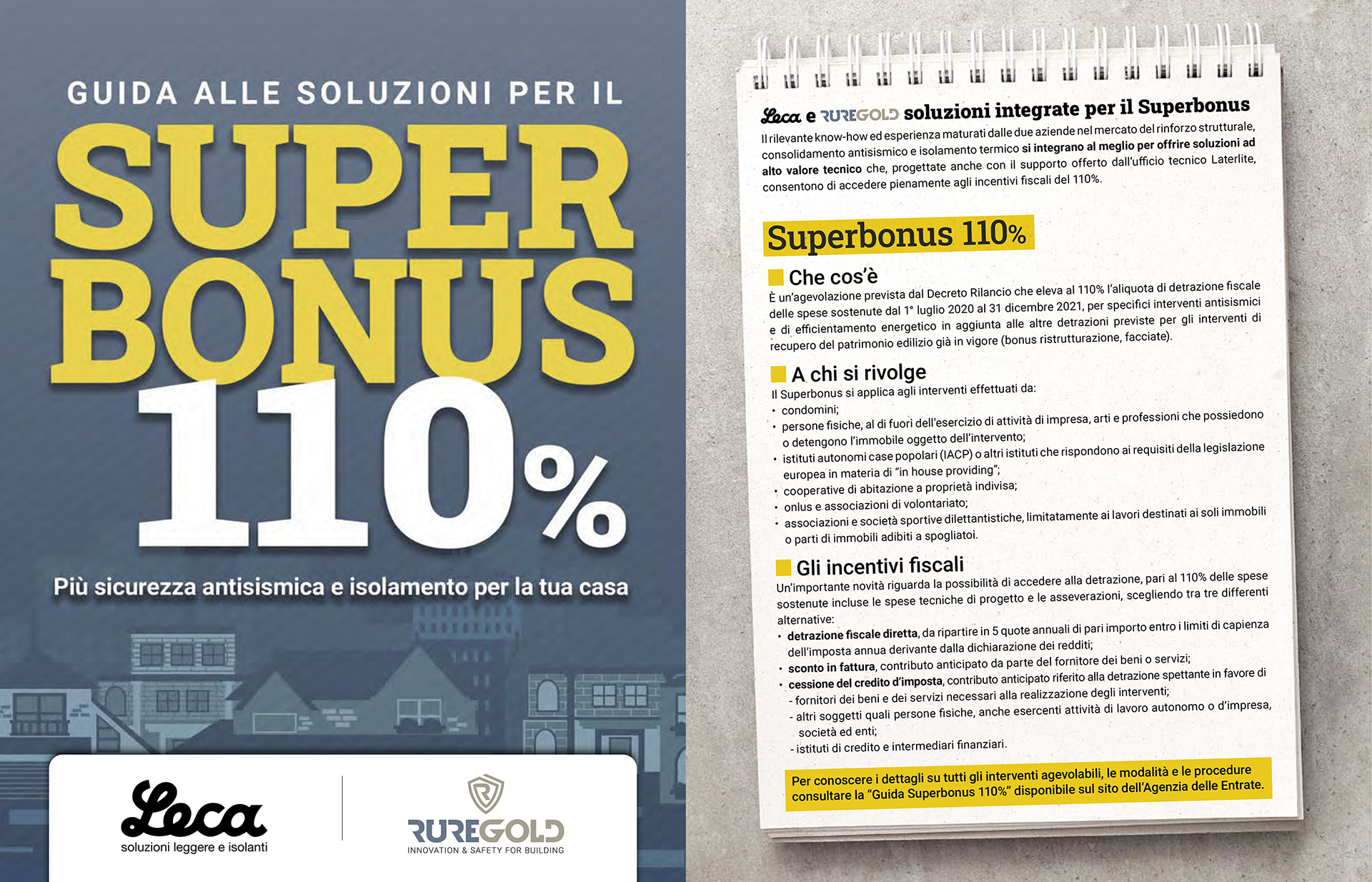 Il Gruppo Laterlite ha sviluppato un’utile guida dedicata a proprietari, condomini, enti, cooperative e associazioni, per guidarli nel complesso percorso di accesso alle detrazioni fiscali in materia edilizia. Le soluzioni integrate di prodotti Leca e Ruregold, messe a punto dall’ufficio tecnico Laterlite e previste dalla guida, consentiranno la realizzazione di interventi di rinforzo strutturale, consolidamento, miglioramento antisismico ed efficientamento energetico.