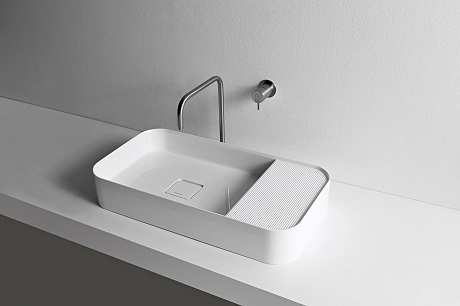 Le dimensioni dei nuovi lavabi sono in molti casi contenute, ma il volume disponibile è sfruttato al meglio. Ciò che appare più evidente è il desiderio di accrescere, tramite scelte progettuali strategiche, la funzionalità complessiva dell’elemento. In questo senso è significativa la presenza di molti modelli di piani d’appoggio supplementari collocati lateralmente al bacino, che si estendono senza soluzione di continuità e sono realizzati con lo stesso materiale del lavabo, ma anche il progressivo ampliamento del piano d’appoggio posteriore destinato alla rubinetteria, che diventa uno spazio utile per appoggiare oggetti e accessori.