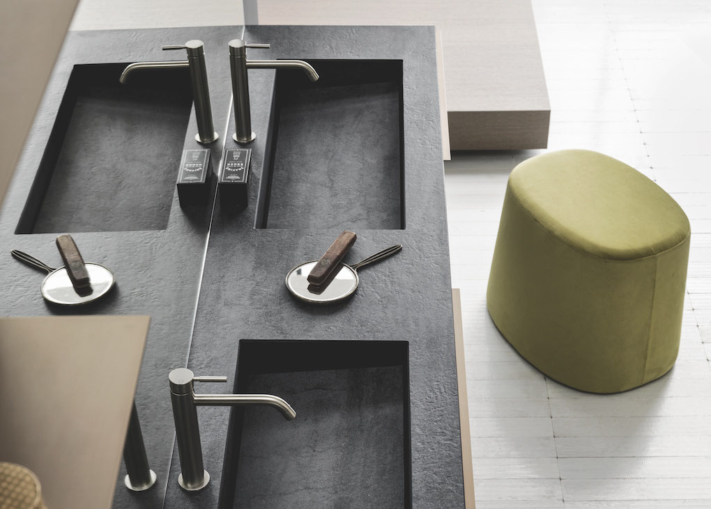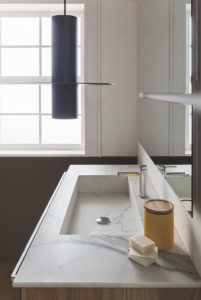 L’ampio piano in Laminam Pietra di Savoia Antracite con doppio lavabo integrato Plaza, inserito nella composizione Sky 186 (foto in alto), regala un aspetto moderno e sofisticato, in cui le sfumature calde e la piacevolezza tattile della texture rendono unico l’ambiente bagno.