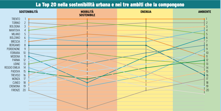In linea generale, però, le prime 19 città ricoprono sempre le prime 20 posizioni di tutte le classifiche parziali, a eccezione di Firenze che dalla top 20 nell’area della mobilità attestandosi al 25esimo posto.