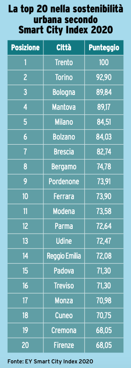Trento, Torino e Bologna: sono queste le città che si collocano in vetta all’edizione 2020 di Smart City Index, analisi condotta da Ernst & Young che esamina i capoluoghi italiani in base al loro livello di sviluppo di reti e infrastrutture e in base alla capacità di innovare e offrire servizi di qualità ai cittadini.