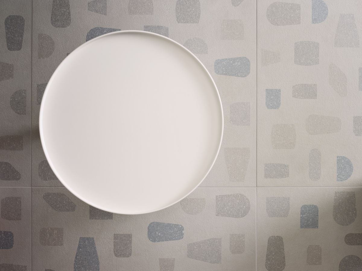 Fragments by Pierre Charpin è declinata in 4 tonalità naturali: dalla più chiara Milk alla più scura Charcoal (grigio scuro) passando attraverso il grigio nuvola Cloud e il più caldo Tan sia nei decori Form e Oblong che nelle superfici mono-cromo effetto resina (Resin) ed effetto legno (Wood).