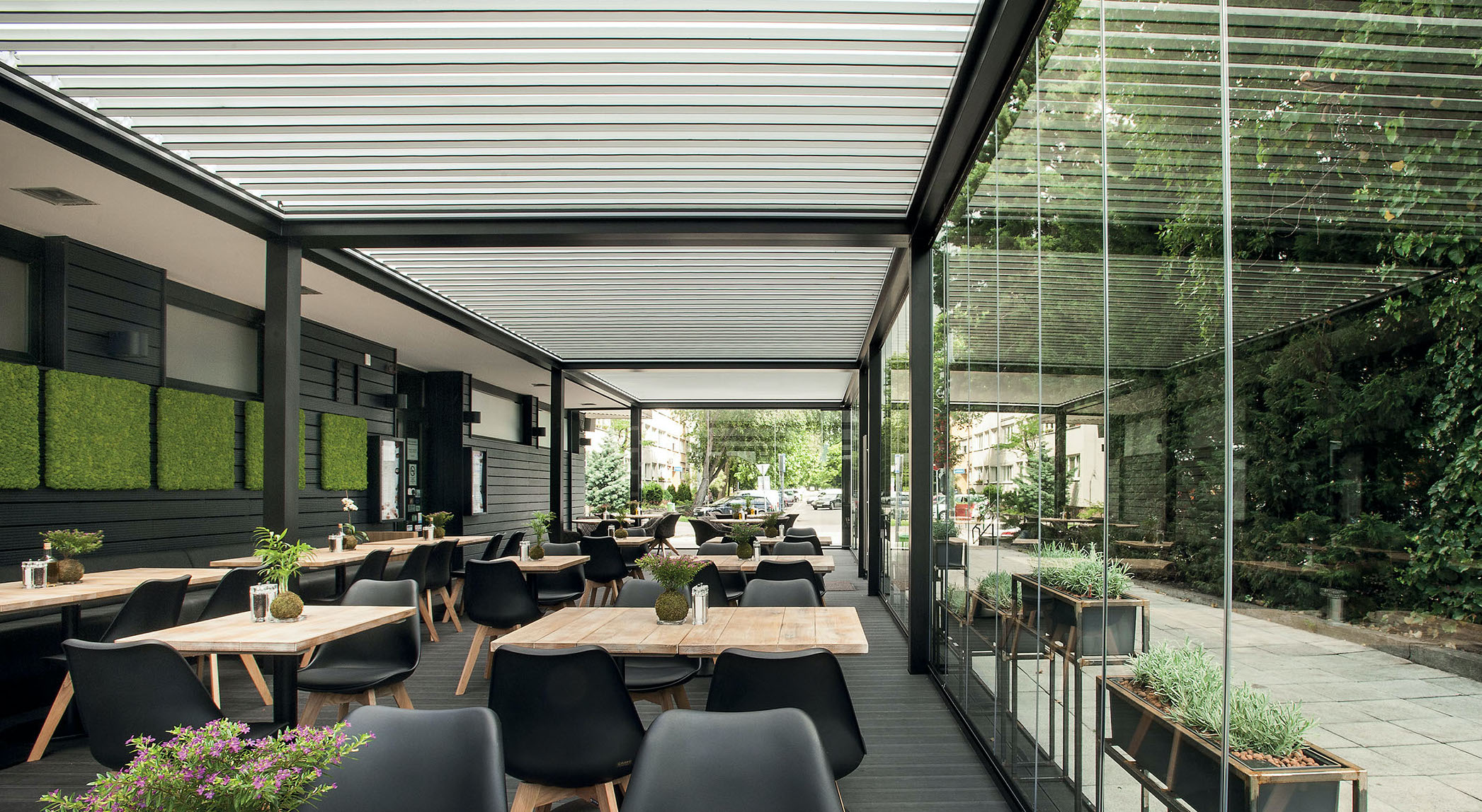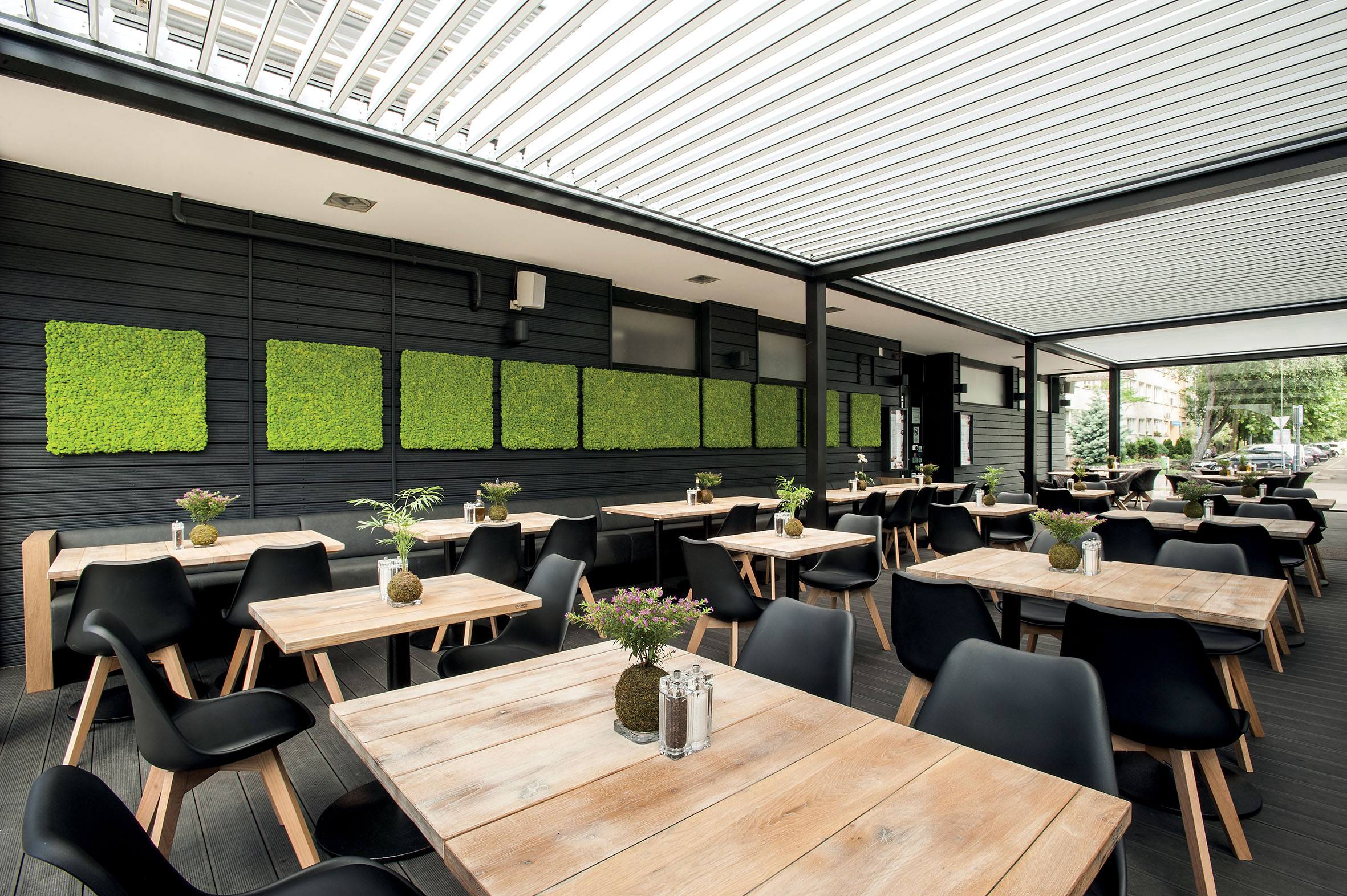 «A Pest abbiamo creato un’atmosfera unica, minimal ma al contempo accogliente, sfruttando al meglio la splendida terrazza del locale e rendendola fruibile durante tutto l’anno grazie all’installazione di un sistema di pergole Gibus. La scelta di queste pergole è stata orientata sia dalla loro capacità di integrarsi alla perfezione con la nuova identità che volevamo dare al locale, sia dalla versatilità delle soluzioni proposte dal brand. Abbiamo realizzato l’ampliamento puntando sul modello Gibus Twist a isola e optando per tre moduli affiancati delimitati da pareti vetrate scorrevoli. I risultati positivi sono stati immediati: la struttura ha trasformato la terrazza in un luogo luminoso e ospitale, in grado di garantire non solo protezione ma anche un ottimo isolamento termico e acustico.» Arch. Gaspar Bonta.