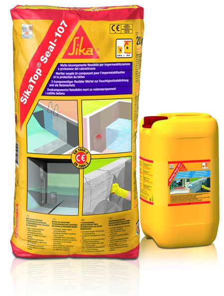 SikaTop Seal-107. Se c’è necessità di proteggere e impermeabilizzare, oltre al calcestruzzo, supporti che devono rimanere flessibili, poiché soggetti a tensioni (come le strutture pedonabili) Sika ha proposto questa malta cementizia bicomponente a basso modulo elastico e rinforzabile è ideale per proteggere superfici in calcestruzzo contro gli attacchi di gelo e disgelo, anidride carbonica, ma anche acqua.