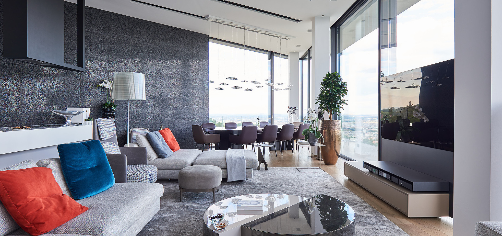 Nei bagni e in cucina è il design che regna incontrastato. Le superfici di grande impatto estetico e dalle notevoli prestazioni tecniche di Lea Ceramiche risultano perfettamente in linea con il progetto all’avanguardia di questa villa sviluppato dall’ungherese Nara Studio. In alcuni bagni, spicca l’eleganza delle piastrelle Absolute Total White che si alterna all’effetto ottico a onde del rivestimento Waves, firmato Patrick Norguet. Sempre nei bagni e sempre frutto della collaborazione con il designer francese, la collezione Naive, incontro fra design e tecnologia, fra artigianato e industria, fra grès porcellanato e smalti per un effetto grafico che ricorda linee a matita tracciate a mano. E ancora, la collezione Basaltina con spessore 3,5 mm, che si ispira alla pietra naturale, con un look minimal e suggestivo.