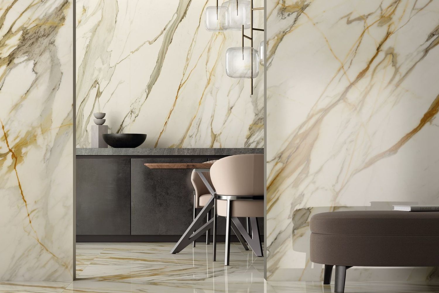 Un lusso contemporaneo che si riscopre in venature quasi grafiche, in infiniti percorsi che attraversano il materiale, un mondo senza tempo dove la bellezza dirompente della natura si fonde con la capacità dell’uomo di saperla riprodurre attraverso la tecnologia.