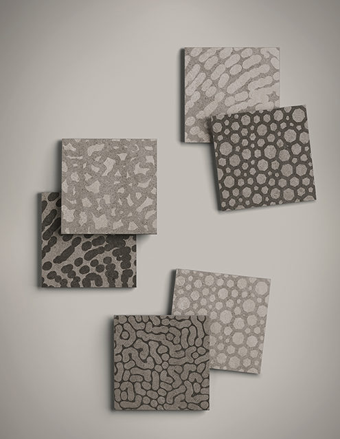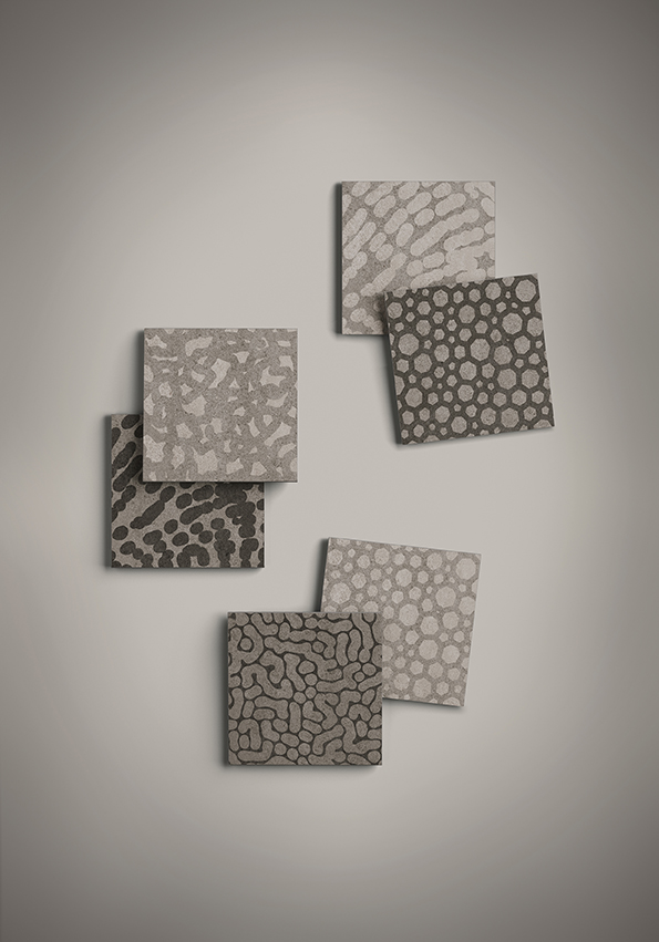 Zoom è la rappresentazione in chiave macro di quattro pattern che riflettono sull’organicità del cemento – Reef, Dry, Foam, Tide – estremizzati attraverso un tratto vigoroso e ingigantito. I motivi grafici vengono proposti in formato 60×60 cm per comporre veri e propri tappeti decorati, oltre che nel più classico formato 20×20 cm che reinterpreta in chiave inedita la tradizionale forma decorativa delle cementine. Il progetto presenta una varietà di grafiche da posare a pavimento o a parete in maniera randomica, per conferire allo spazio un’impronta decisamente contemporanea, decorativa e distintiva.
