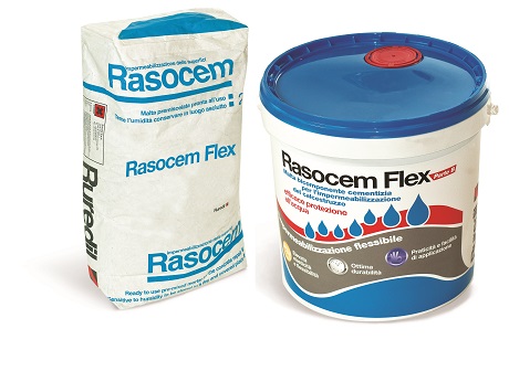 Rasocem Flex è un prodotto bicomponente a base di legante idraulico cementizio, inerti selezionati, microfibre di polipropilene e particolari resine sintetiche. Applicato in spessore sottile, genera una membrana in grado di resistere alla pressione permanente dell’acqua. Rasocem Grip invece è un prodotto a base di miscele di cementi, filler selezionati e una dispersione di speciali resine sintetiche che, una volta miscelato e applicato su calcestruzzo, da origine a uno strato di protezione impermeabile in spessore sottile, resistente alla pressione permanente diretta (spinta indiretta dell’acqua fino a 0,5 atm).
