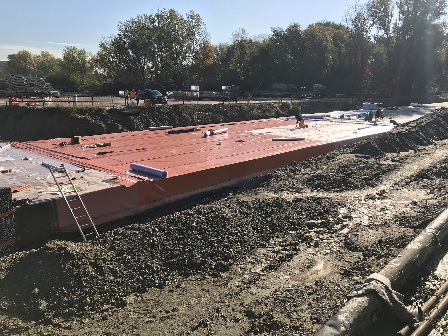 Ogni compartimento, a cui sono applicate diverse valvole, misura un’estensione di circa 100-120 mq. La stratigrafia termina con l’applicazione di un altro strato di tessuto non tessuto seguito da uno in polietilene (Pe). L’adozione di questa tecnica di saldatura (vacuum) genera 3 vantaggi:
