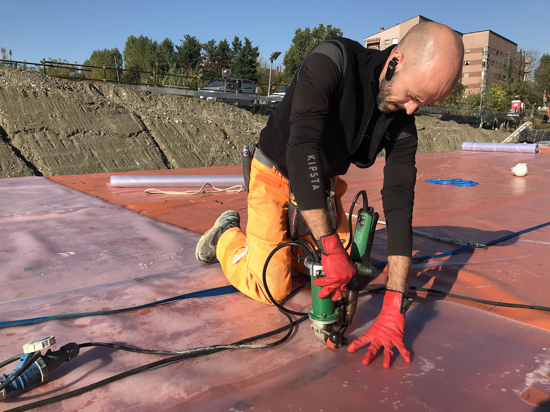 Per raggiungere questi risultati Tecnomanto ha scelto apparecchiature Leister: in particolare le saldatrici Twinny a doppia pista per tutte le saldature del primo strato in Pvc. Sempre con Twinny si realizzano i rettangoli di 100 mq dei compartimenti.