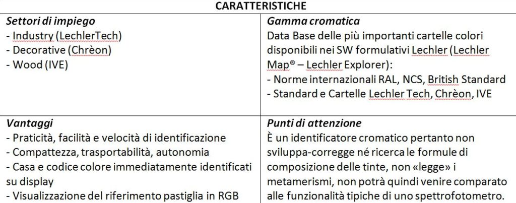 Il suo impiego semplifica agli operatori la selezione del colore da realizzare: attraverso la verifica nel database interno indica le migliori corrispondenze con cartelle e collezioni colore Lechler.
