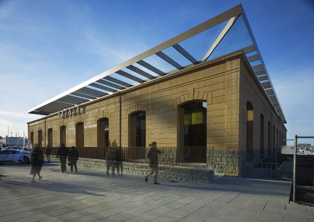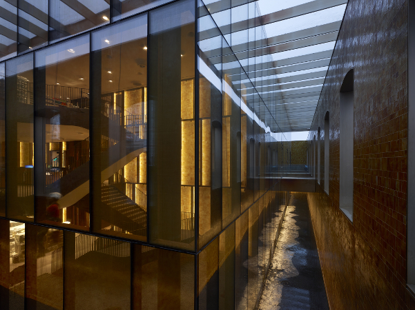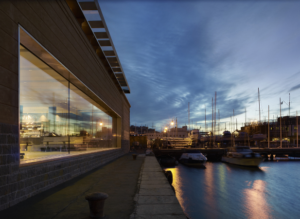 In particolare, lo studio non è andato a modificare il volume originario ma l’ha piuttosto occupato scavando al suo interno nuovo corpo architettonico completamente indipendente. Lo stacco fisico tra il nuovo “edificio” e il paramento storico ha consentito di realizzare uno spazio tra interno ed esterno di grande suggestione, interamente rivestito in pietra d’Istria, mentre l’involucro interno è chiuso dal vetro che riflette i contorni delle mura del magazzino e delle sue aperture permettendo di rendere visibili le attività che vi si svolgeranno.