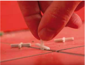 sottile strato, premendo sul fondo per ottenere una buona adesione, quindi applicare con la spatola dentata la quantità di adesivo idonea al tipo e formato della piastrella da incollare. Eseguire la regolazione e registrazione delle piastrelle entro 40 minuti dalla messa in opera. Pressare fortemente la piastrella per consentire una distribuzione uniforme dell’adesivo e un contatto che permetta una bagnatura del retro della piastrella superiore al 70%. Per maggiori dettagli consultare le schede tecniche specifiche per ogni prodotto.