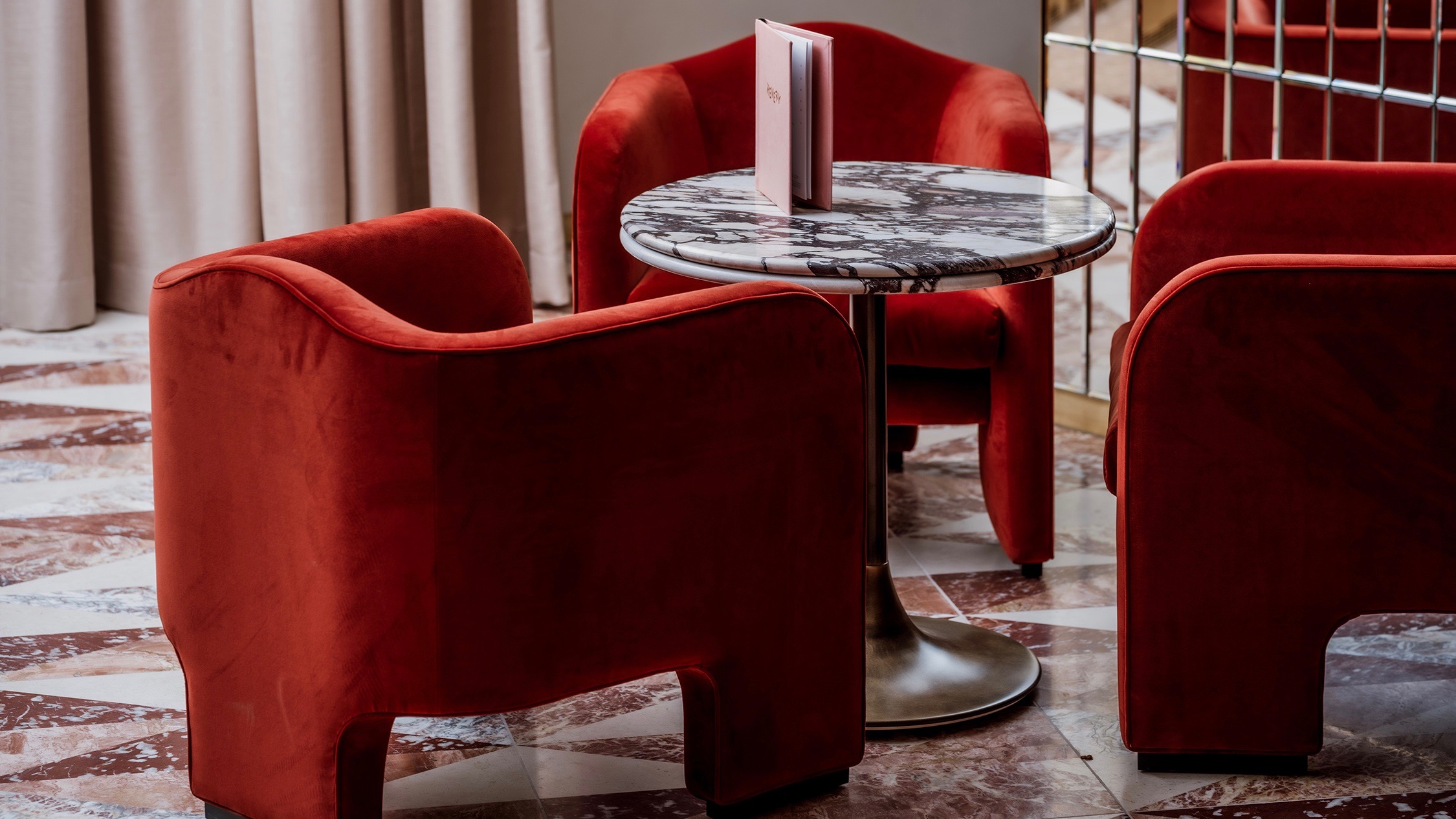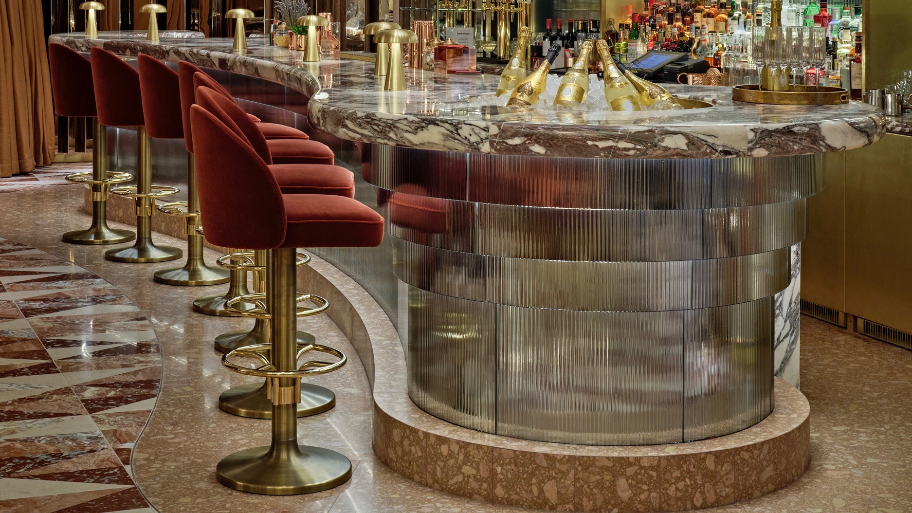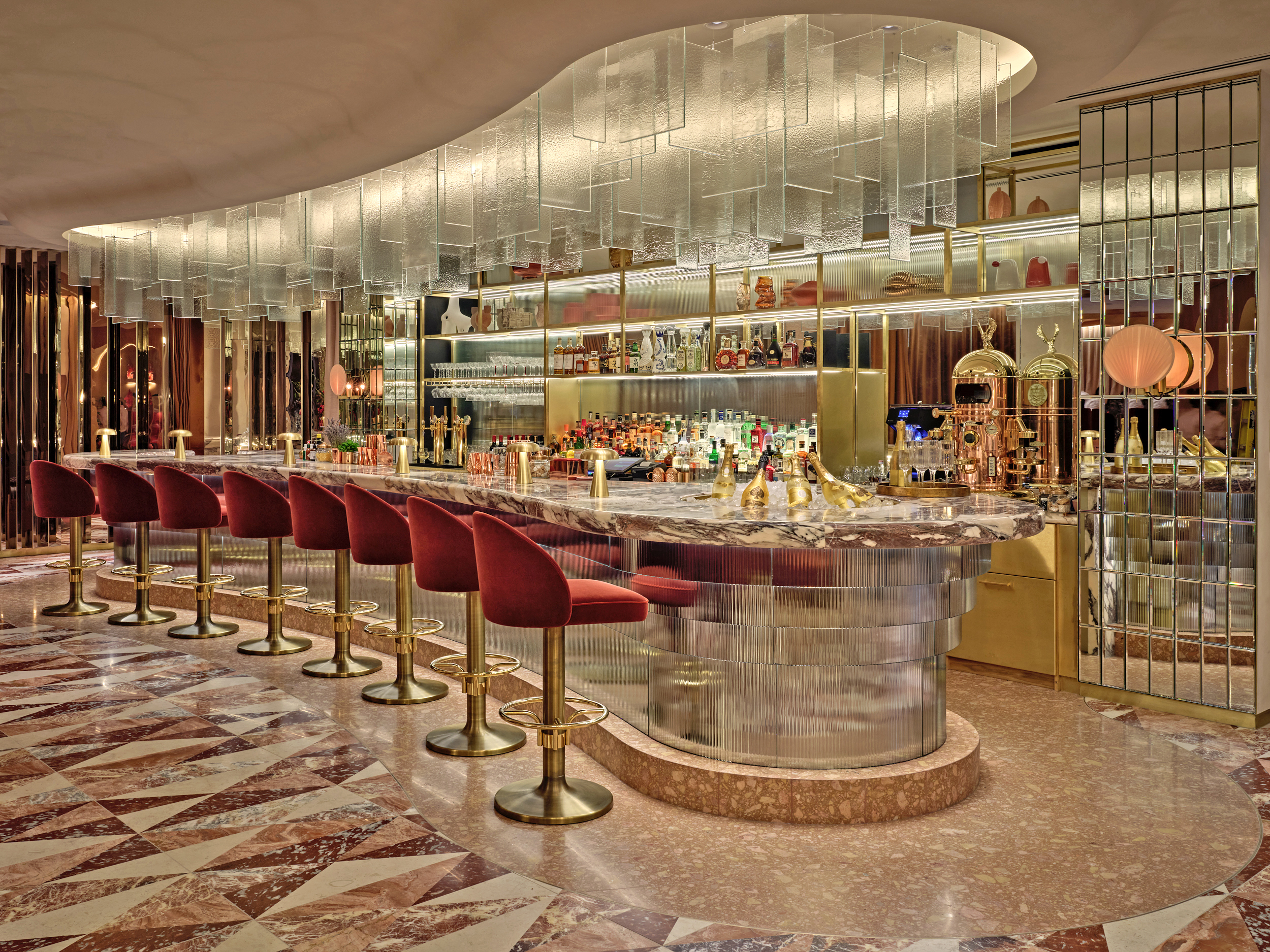 Un’oasi incantevole progettata dallo studio AvroKO per restituire un’esperienza sofisticata, tra lussuose sedute rosse, lampadari spettacolari, pareti specchianti, elementi di design.