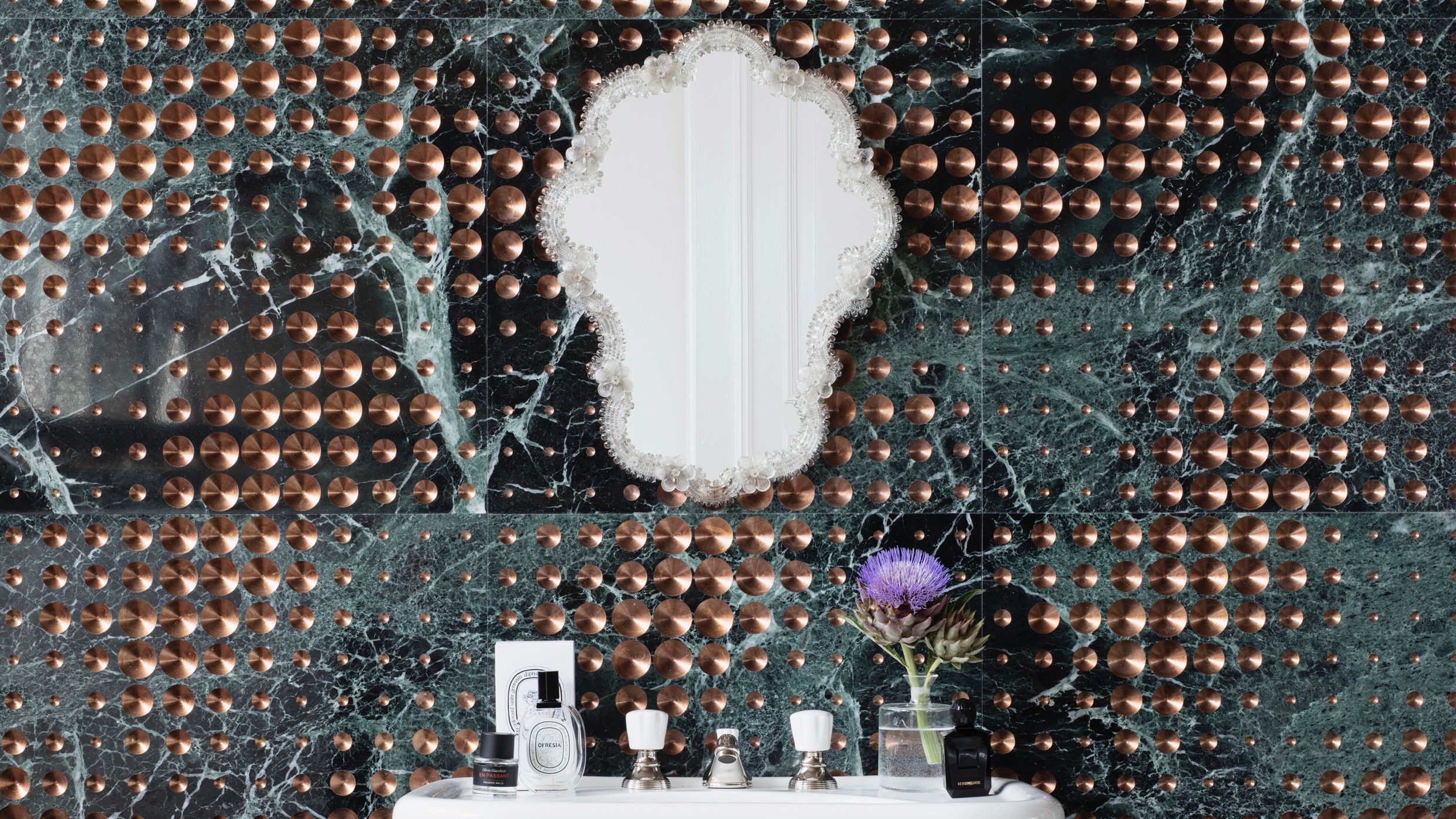 Disegnato da Raffaello Galiotto, il pattern Luxury di Lithos Design della collezione Dissonanze interpreta il rivestimento murale in chiave contemporanea indossando una veste sfarzosa: marmi esclusivi – Calacatta Viola, Arabescato Vagli, Rosso Levanto, Rosa Egeo, Carrara Ghiaccio, Verde Tinos – vengono ulteriormente valorizzati dai bagliori preziosi delle incisioni decorate con foglie oro, rame e bronzo.