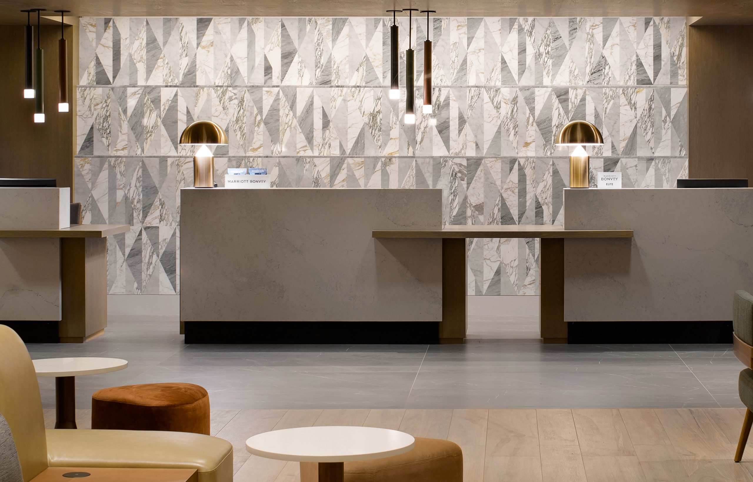 Con l’uso delle delicate sfumature di pietra naturale, come il Paon Royal, la Breccia di Serravezza, il Bardiglio Nuvolato e il Carrara Ghiaccio, il rivestimento a parete Tangram Patchwork di Lithos Design cattura magistralmente il concetto, creando un punto focalizzante nell’area della reception.