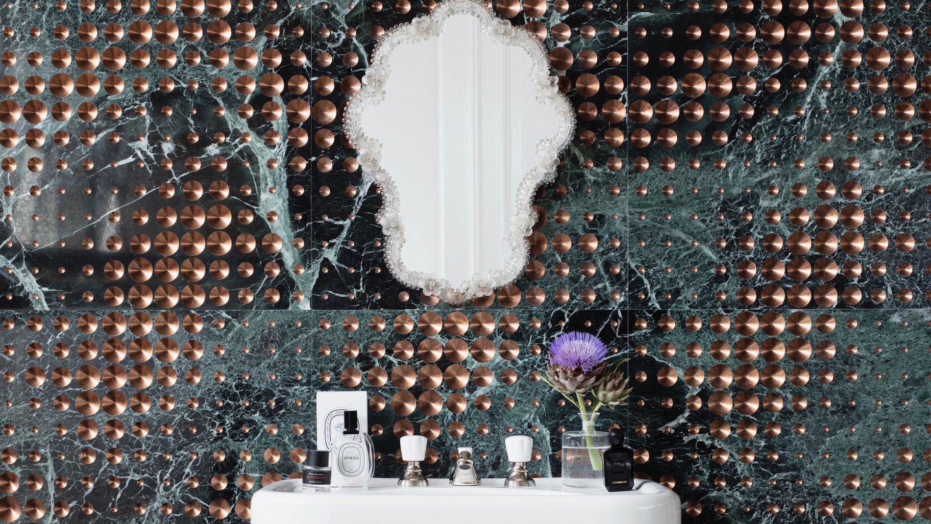 Dissonanze interpreta il rivestimento murale in chiave contemporanea con la texture Luxury, utilizzando marmi esclusivi come calacatta viola, arabescato vagli, rosso levanto, rosa egeo, carrara ghiaccio e verde tinos, impreziositi da foglie d’oro, rame e bronzo.