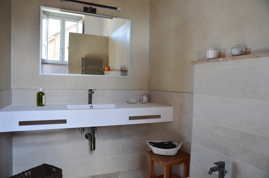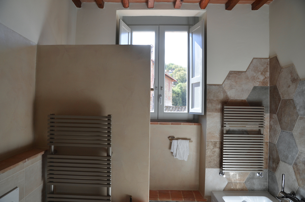 La tre tonalità scelte dalla progettista e una tecnica di applicazione con chiaroscuri e spatolate appena accennate, donano alle superfici un aspetto caldo e naturale in armonia con l’atmosfera che pervade la storica costruzione.