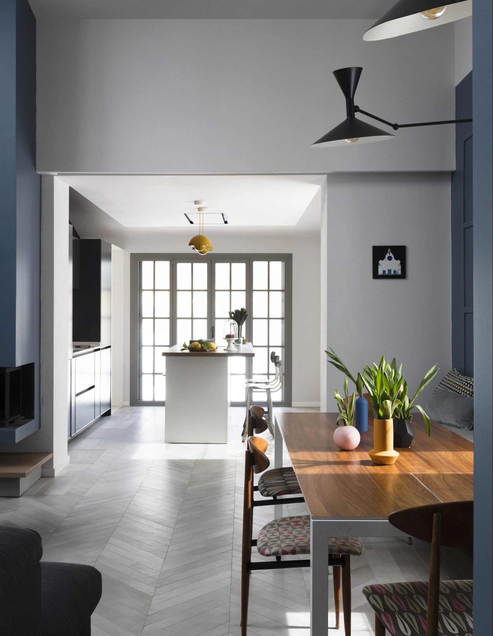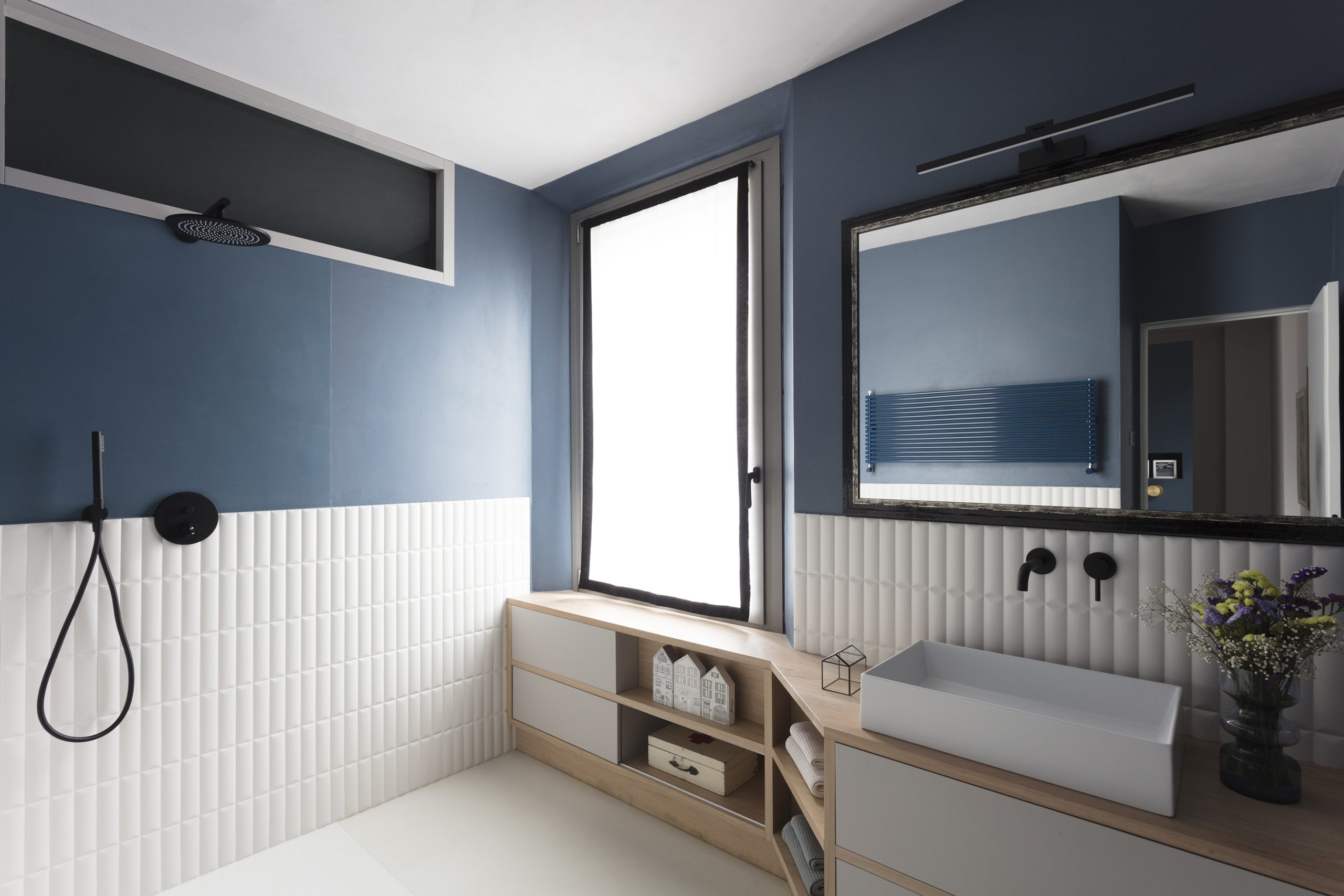 Una volta rivisti tutti gli ambienti, i progettisti hanno pensato alle finiture e agli arredi, molti dei quali realizzati su misura da artigiani. Tutta l’abitazione è declinata sui toni del grigio-azzurro, accostati al bianco luminoso e al verde.