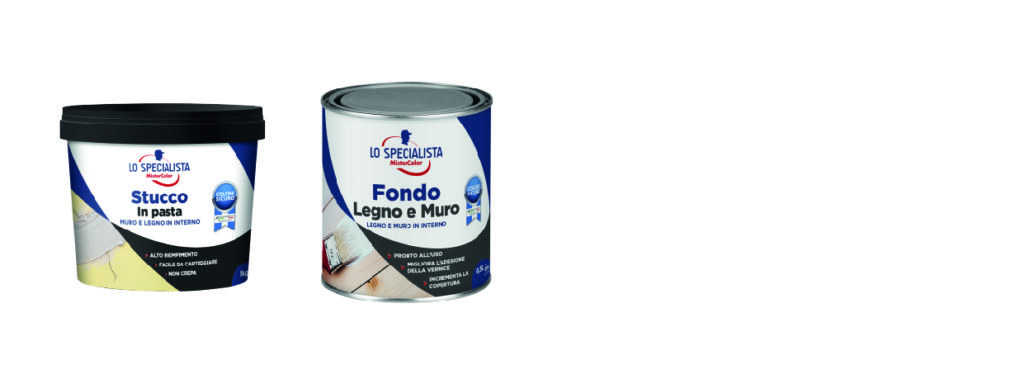 La gamma legno di Lo Specialista di MisterColor si completa infine con un prodotto di preparazione – il fondo per legno in interni – e un prodotto ausiliario – lo stucco in pasta per legno in interno.