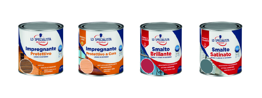 - 16 varianti di smalto all’acqua per legno, satinato o brillante, in diverse colorazioni e altrettante nella versione a solvente specifica per esterni;