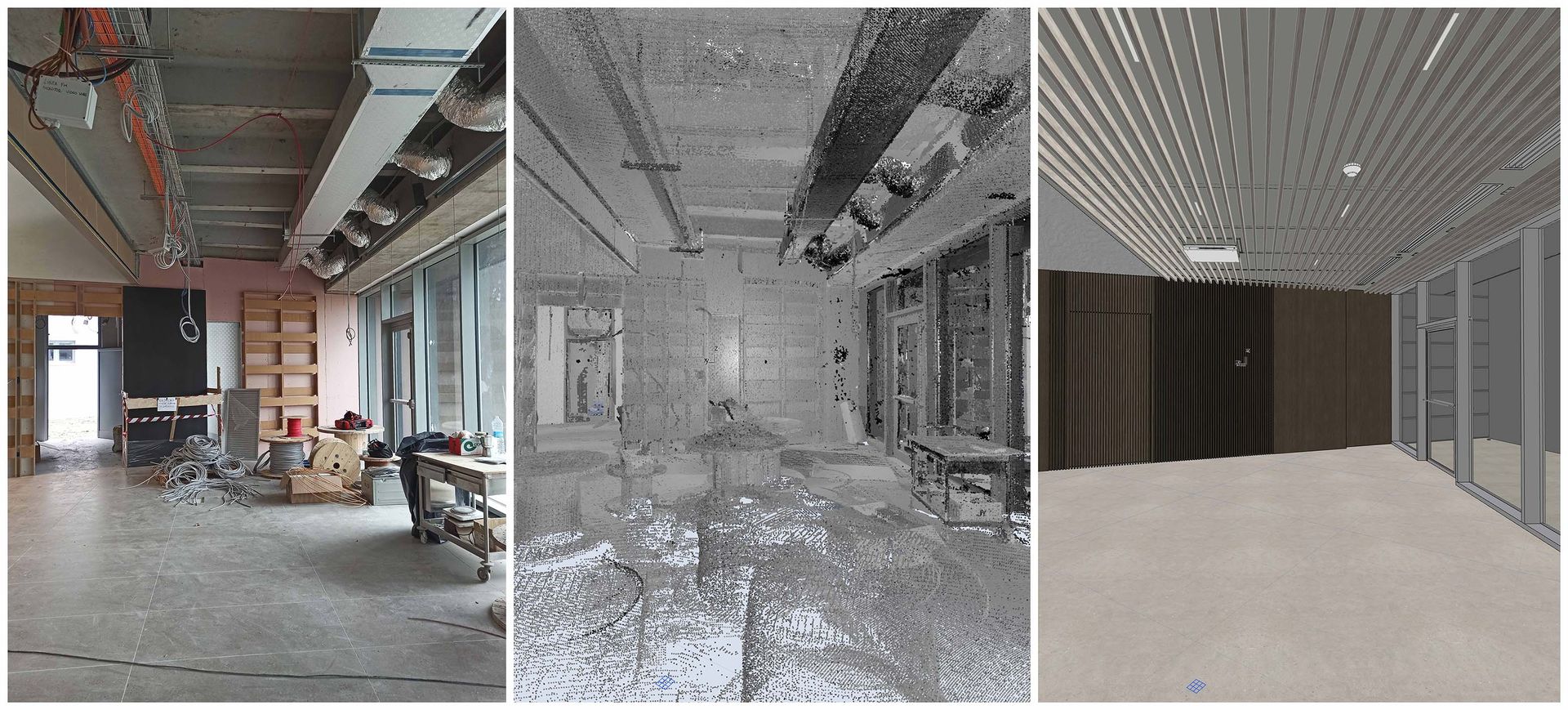 Le nuvole di punti sono state poi importate e rimodellate in Archicad per creare il modello dello stato di fatto e limitare i possibili errori. Questi modelli sono interamente navigabili e permettono di avere le informazioni da cui poi partire per la creazione dei nuovi concept progettuali.