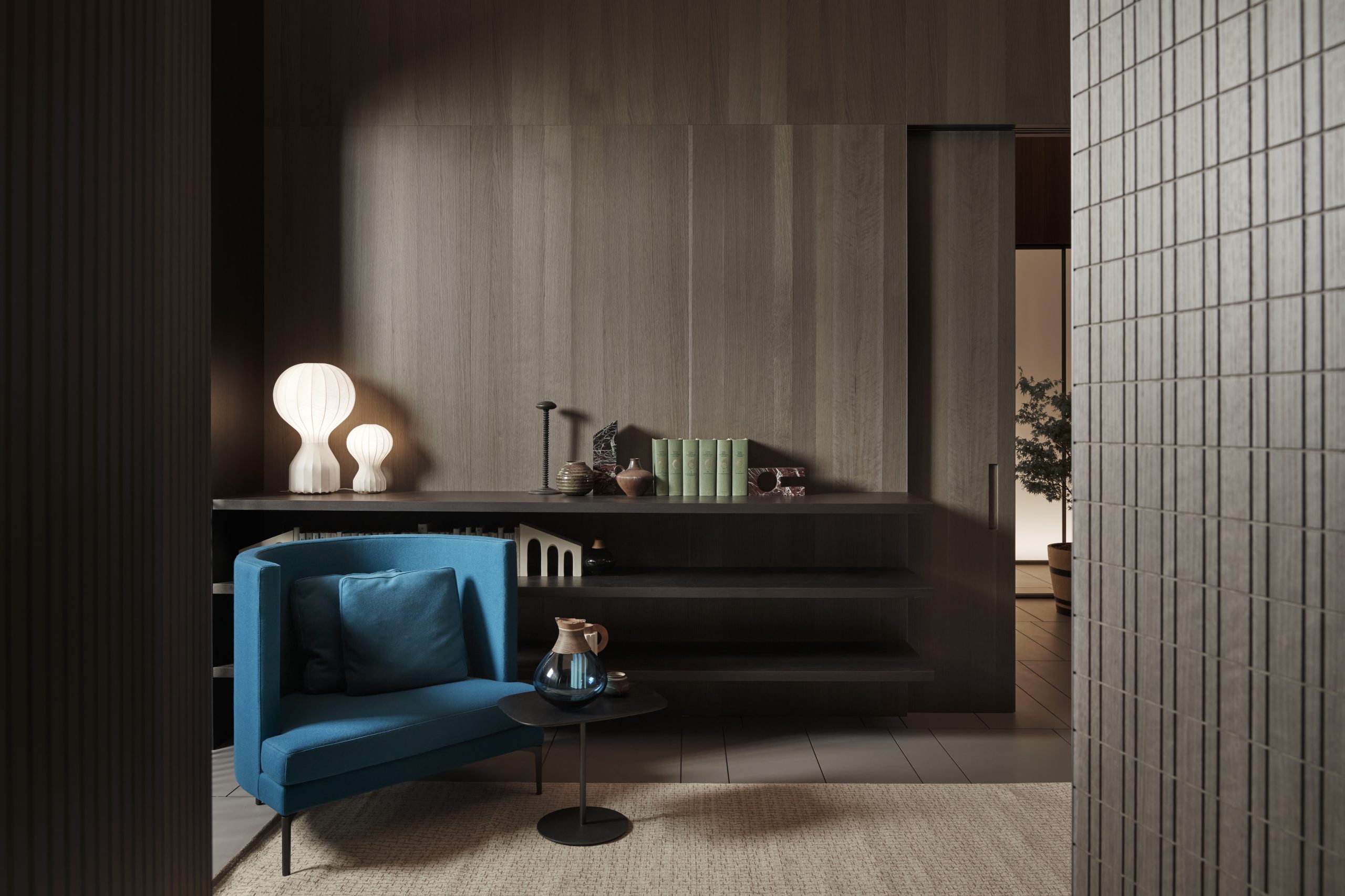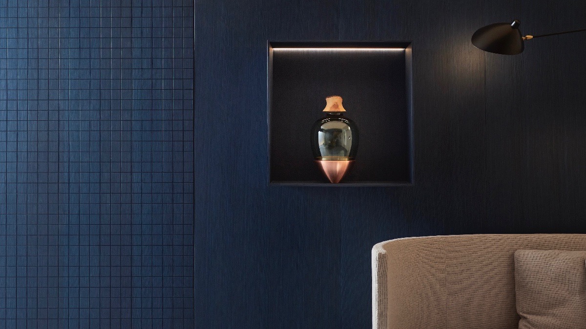 L’audacia delle sperimentazioni cromatiche di Lualdi si manifesta nei toni vivaci del blu e del bordeaux, che si insinuano nei freschi pattern del legno o si posano su superfici piatte in essenza, creando un gioco di accostamenti e contrasti senza tempo. Il blu si fa padrone anche sul vetro e sull’alluminio, fondendosi armoniosamente in superfici vetrate e profili metallici, regalando un’eleganza sottile ma decisa.