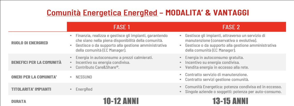 In una prima fase (10-12 anni) EnergRed andrà a finanziare, realizzare e gestire gli impianti —garantendo che siano nella piena disponibilità della comunità— e gestirà o darà supporto alla gestione amministrativa della comunità (EC Manager), senza alcun costo per la comunità, salvo il costo dell’energia in autoconsumo a prezzi calmierati.