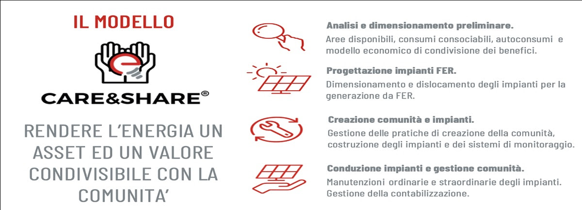 Le due misure possano anche essere cumulate, ma l’importo totale dell’aiuto di Stato non può superare il deficit di finanziamento dei progetti, che mettono ora a disposizione delle CER il loro esclusivo modello «Care&Share» in 4 step: