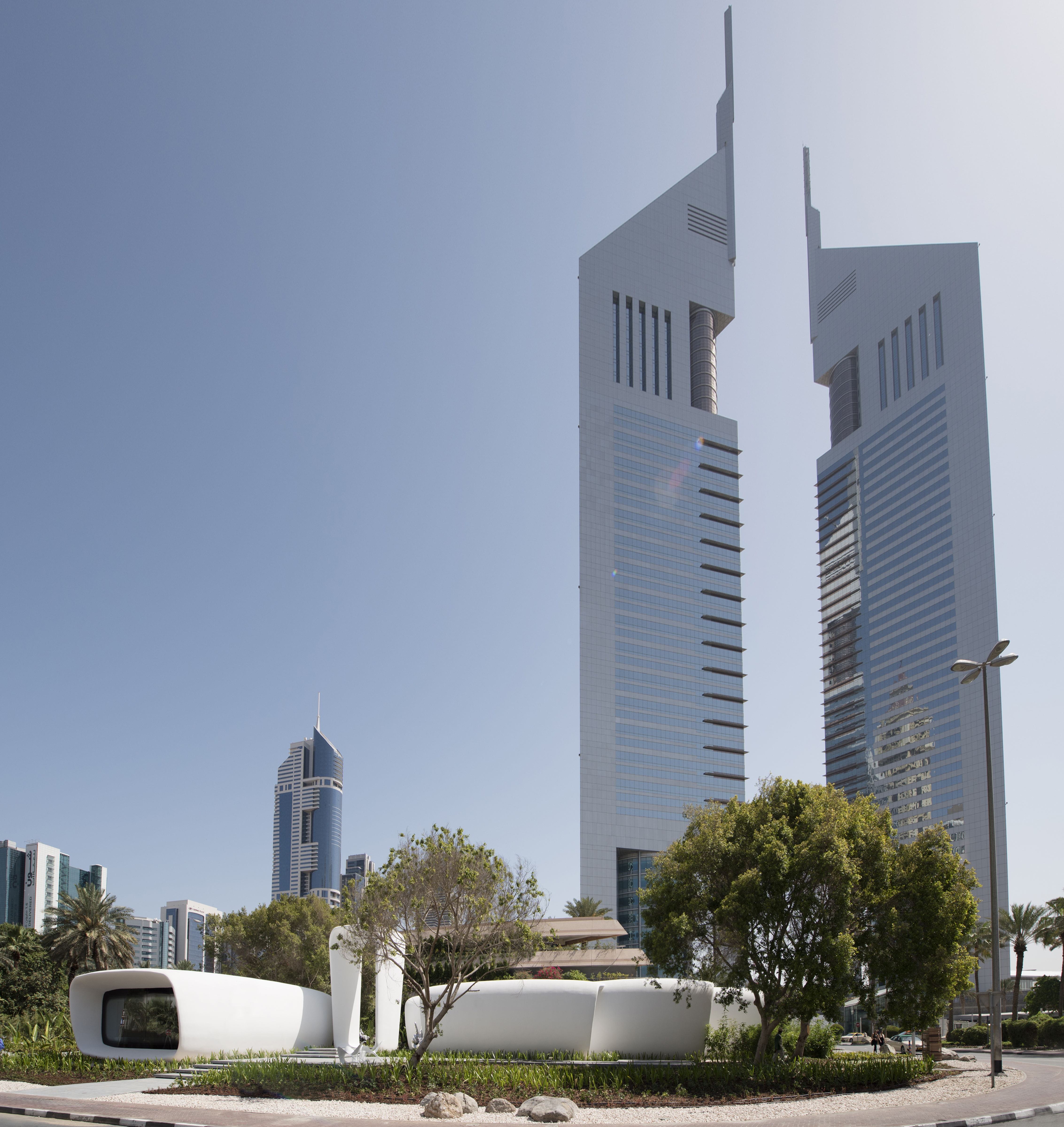 Per stampare questo primo edificio, collocato ai piedi delle Emirates Towers, è stata utilizzata una stampante 3D per il cemento di altezza 6 metri, lunghezza 37 e larghezza 12, dotata di un braccio robotizzato.