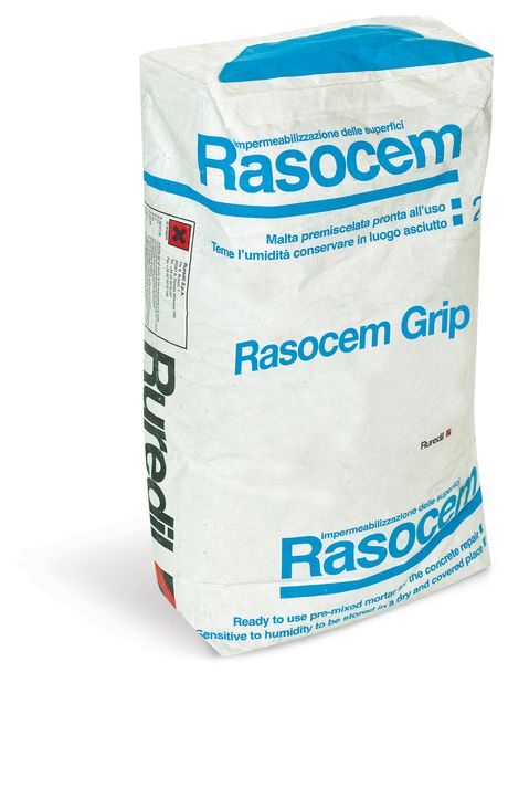 Rasocem Grip di Ruredil è un prodotto a base di miscele di cementi, filler selezionati e una dispersione di speciali resine sintetiche che, una volta miscelato e applicato su calcestruzzo, dà origine a uno strato di protezione impermeabile in spessore sottile, resistente alla pressione permanente diretta. È particolarmente consigliato dove serve una forte adesione al supporto accompagnata da un’elevata capacità di deformazione elastica e assicura protezione anche se applicato su supporti microlesionati superficialmente. È indicato per proteggere e impermeabilizzare sottofondi in calcestruzzo armato microfessurati e soggetti a piccole deformazioni, in strutture quali: opere idrauliche (vasche, serbatoi, piscine, fognature); muri contro terra; opere danneggiate dagli agenti atmosferici (travi, balconi, parapetti).