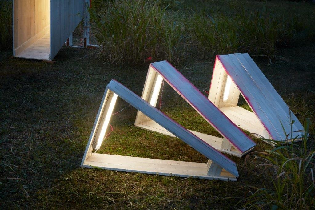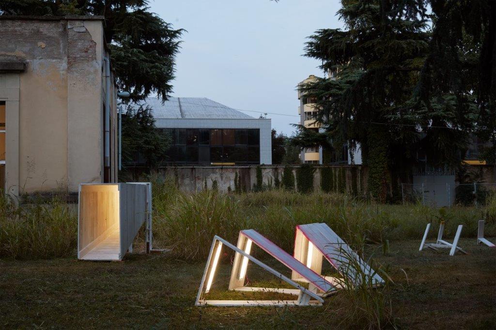 Nell’installazione, le assi di legno che delimitano il cantiere, lasciate al grezzo, trovano nel colore uno strumento per elevarsi ed espandere il loro carattere povero e funzionale; elementi di differenti scale definiscono ciascuno una relazione tra il dentro e il fuori e tra la persona e l’ambiente, attraverso le posizioni e i punti di vista da loro generati.