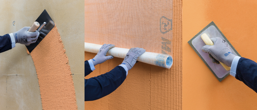 (Applicazione della prima mano di Mapetherm Flex RP. Posizionamento di Mapetherm Net. Rifinitura con frattazzino di Mapetherm Flex RP. Foto di Mapei)