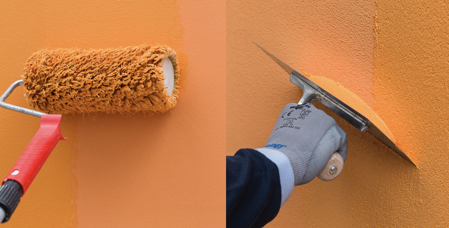 Applicazione a rullo di Silancolor Pittura Plus. Applicazione a spatola di Elastocolor Tonachino Plus