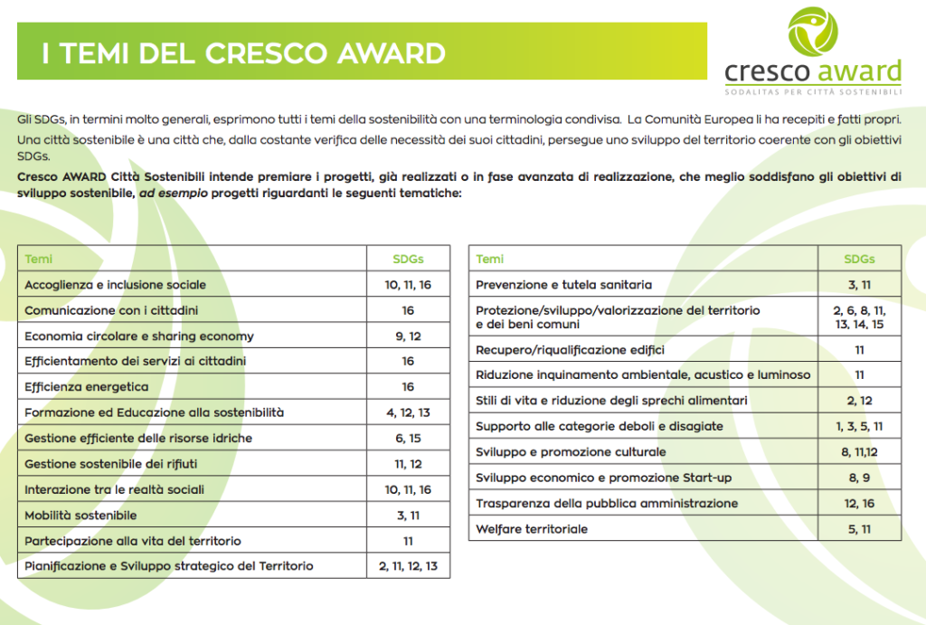 Al via la seconda edizione di “Cresco Award – Città sostenibili“, il premio organizzato da Fondazione Sodalitas e Anci per valorizzare le iniziative dei Comuni italiani più efficaci nel promuovere in modo diffuso lo sviluppo sostenibile dei territori.