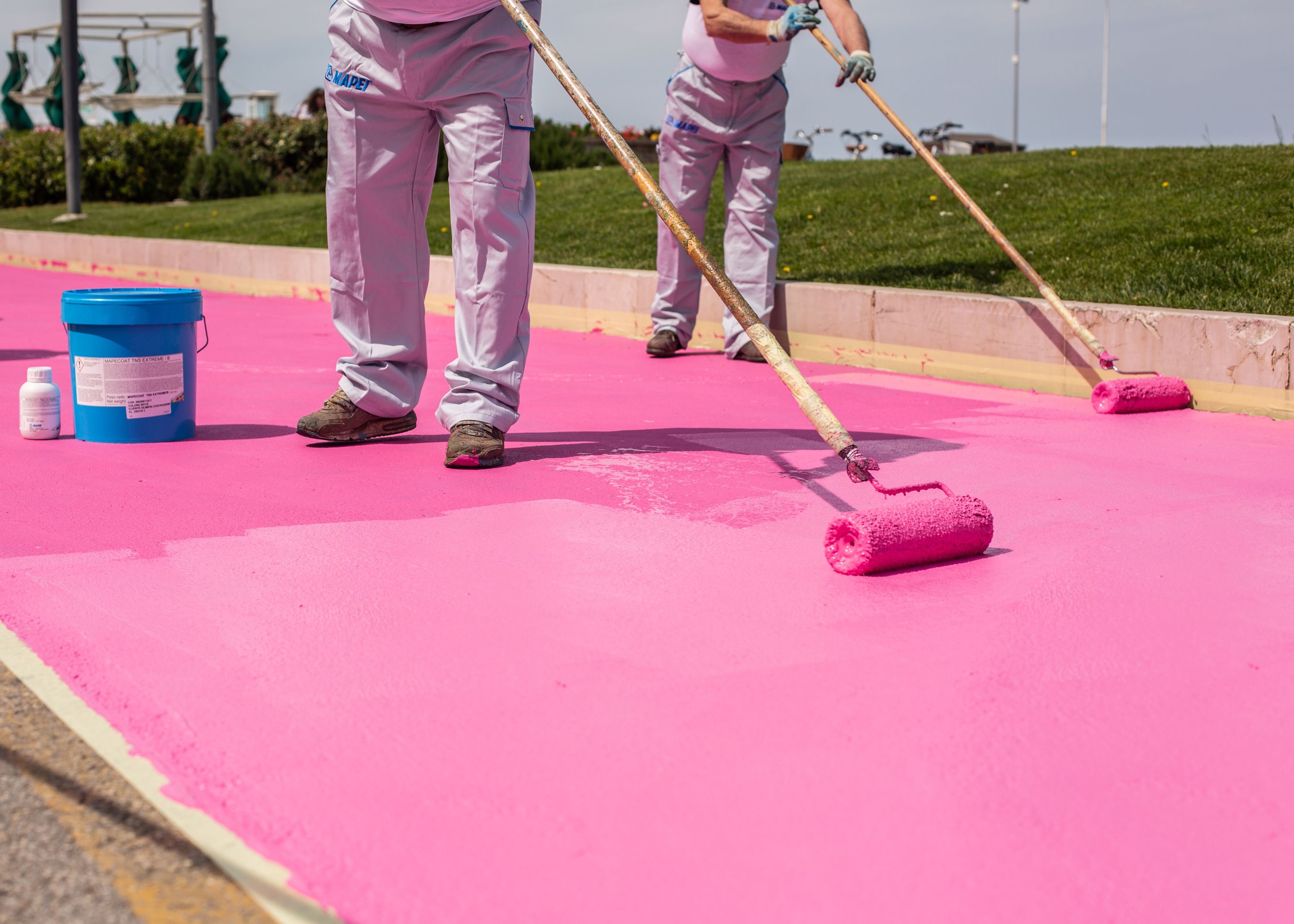 Mapecoat TNS Extreme si caratterizza per l’elevata resistenza al traffico e durabilità e le performance di prodotto, essenziali per la realizzazione della pista: rapidità di asciugatura, versatilità di applicazione su sottofondi esistenti e possibilità di realizzare il rivestimento nel colore desiderato. Mapecoat TNS Extreme è stato fornito nel colore rosa 80118 della Master Collection Mapei, che richiama il caratteristico colore del Giro d’Italia, e applicato per un totale di 2.300 m2 lungo 1 km di pista ciclabile. Inoltre, è stato utilizzato il primer Mapecoat TNS Primer EPW, indicato per migliorare l’adesione di Mapecoat TNS Extreme all’esistente sottofondo in asfalto rivestito da vecchia vernice.