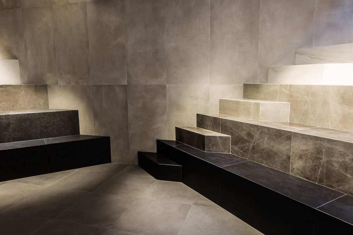 L’ingresso in bianco e nero come un portale monumentale che crea uno spazio teatrale e una facciata sull’interno, offre ai visitatori una particolare prospettiva degli spazi espositivi. I volumi del pian terreno, di differenti materiali, riportano a frammenti di piramidi che si innalzano verso il soffitto: ogni gradino della piramide è costituito da diversi tipi di gres i cui effetti visivi (cemento, marmo, pietra) sono armonizzati in una palette colori uniforme.