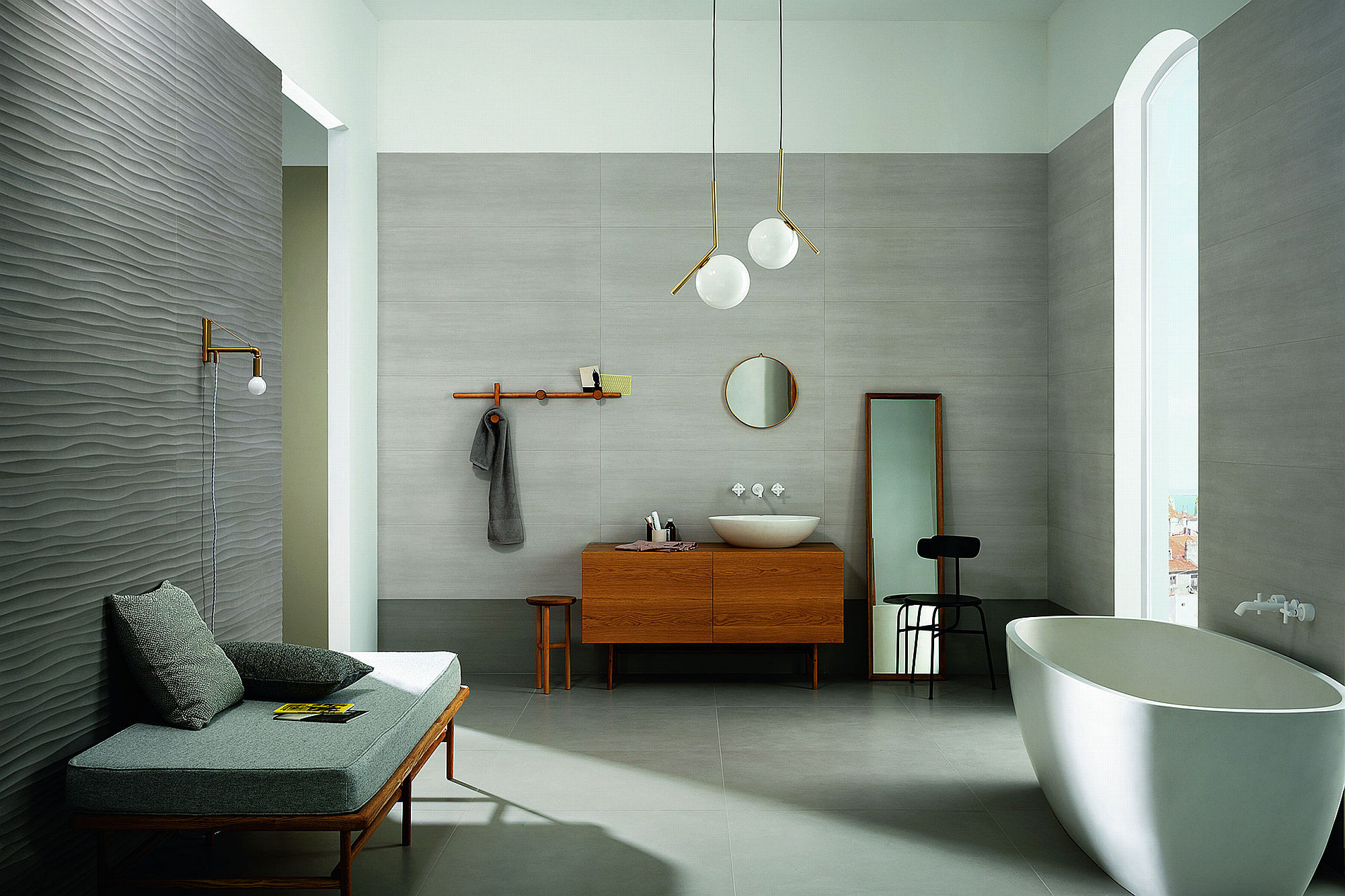 Materika, prodotta nei colori Off white, beige, grigio, fango, antracite, è particolarmente idonea per rivestire bagni residenziali, ma anche servizi e quinte di ristoranti, uffici, hotel, wellness.