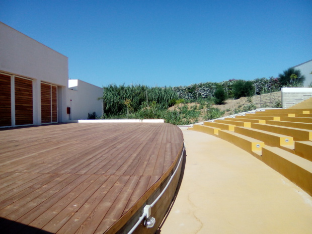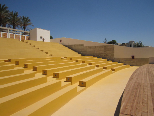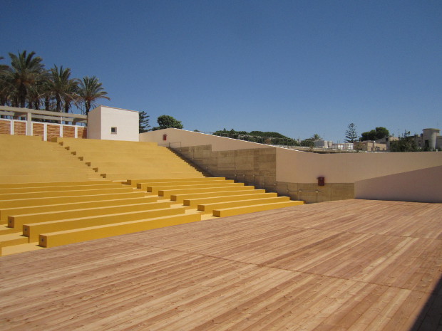 I caldi colori della cavea assorbono la luce intensa e riflettono le sfumature della macchia mediterranea.