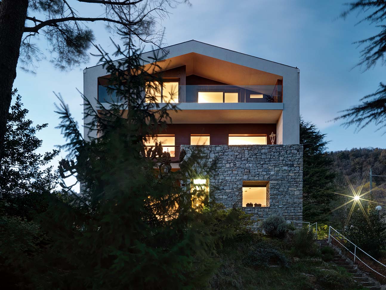 L’edificio si trova in un contesto collinare al limitare del bosco, alle pendici del monte Bollettone, in una zona residenziale con ampi giardini e spazi verdi. L’immobile residenziale, si sviluppa su tre piani fuori terra come un’unica unità abitativa di cui fa parte anche il sottotetto recuperato a fini abitativi.