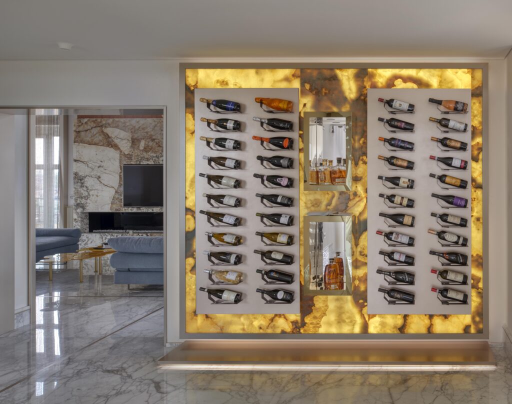 L’abitazione si articola su 4 piani: già dall’ingresso la casa mostra la sua raffinata ricerca del bello, con una scenografia che racchiude in sè comfort, stile ed accoglienza. Il living è caratterizzato da doppie altezze che ne sottolineano l’importanza. Qui troviamo dei pezzi storici scelti dal cliente che si integrano con naturalezza con l’arredo contemporaneo scelto dallo Studio. Sullo stesso piano troviamo una wine cellar disegnata su misura e realizzata con un pannello in onice miele retroilluminato arricchita da una cornice in metallo champagne. inferiore. Sul medesimo livello la zona diningroom si presenta pulita ed essenziale, aprendosi con una Show Kitchen a vista.