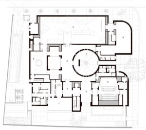 La composizione planimetrica si concentra attorno a un patio centrale, un vuoto circo- lare che funge da “pozzo di luce” da cui traggono illuminazione i locali interni, dal momento che i fronti esterni sono privi di aper- ture a protezione dall’intenso sole marocchino.