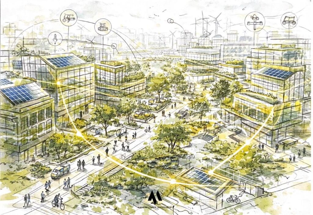 La città viene interpretata come un sistema vivo, relazionale e biofilico, dove architettura, socialità, innovazione e natura devono dialogare in equilibrio.