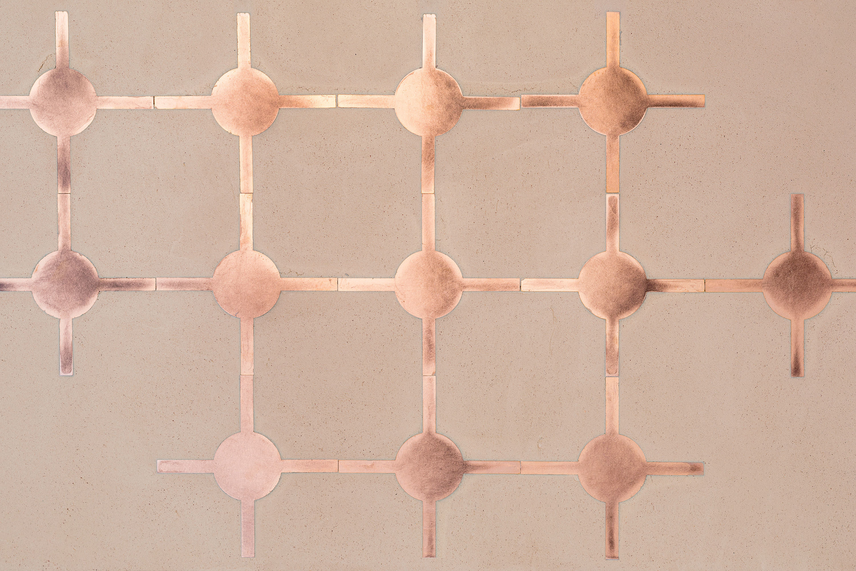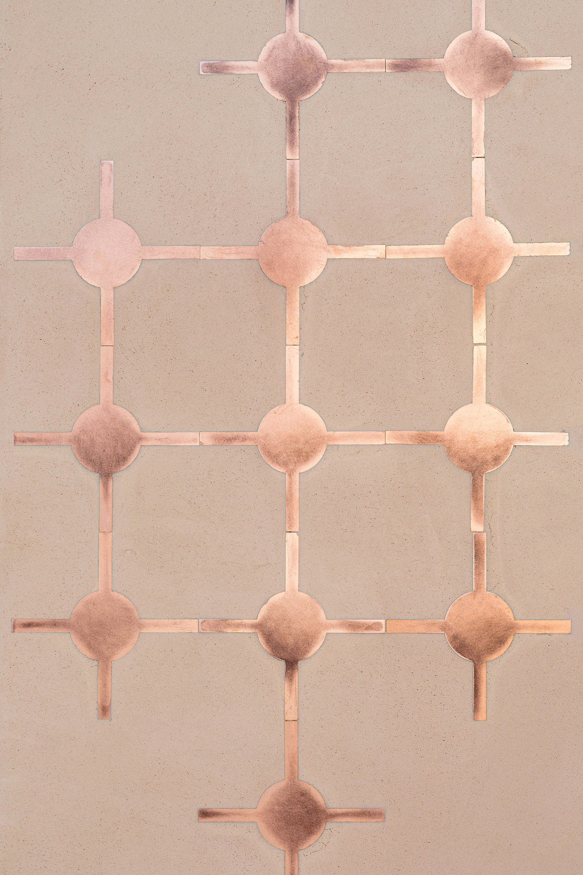 Matteo Brioni lancia il progetto TerraFrame, aggiungendo una novità inaspettata: al pavimento composto da TerraPlus, viene innestato un elemento geometrico chiamato Fuga, ovvero una croce in rame naturale disegnata da Studio Irvine e realizzata da De Castelli. TerraPlus è un impasto di terra cruda additivato con leganti minerali e polimeri resinosi, che permette di ottenere una maggiore resistenza all’abrasione e all’acqua senza perdere la permeabilità. Una soluzione, quella di combinare elementi rigidi con gli impasti in terra cruda, che Matteo Brioni offre da qualche anno, realizzando pavimentazioni studiate ad hoc per ogni situazione.