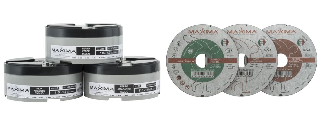 Ideali per tagliare ferro e acciaio inossidabile, i dischi abrasivi sono efficaci ed efficienti grazie alle caratteristiche tecniche specifiche: Maxima di Poviglio (Re) li produce nei diametri 230 millimetri con spessore 2.0 millimetri e 115 millimetri negli spessori 1,0 e 1,6 millimetri; la gamma comprende anche lo spessore 1,3 millimetri, l’unico che ha il vantaggio di garantire la sicurezza dei dischi abrasivi più spessi e la velocità e qualità di taglio di quelli più sottili. Tre sono le varianti proposte: verde e amaranto per il taglio del ferro, e argento, valida anche per il taglio dell’acciaio inox. Le categorie amaranto e argento sono, inoltre, rese uniche dallo specifico sistema di ventilazione, una serie di linee ondulatorie in rilievo sul disco che favorisce il raffreddamento del prodotto durante l’uso, aumentandone la performance e la sicurezza. Considerato che si tratta di un prodotto suscettibile a sbalzi di temperatura e umidità, il confezionamento è fondamentale: i contenitori cilindrici in plastica con tappo sigillato isolano i dischi, preservandone le caratteristiche performanti e la qualità, oltre a garantirne la massima sicurezza una volta in uso.