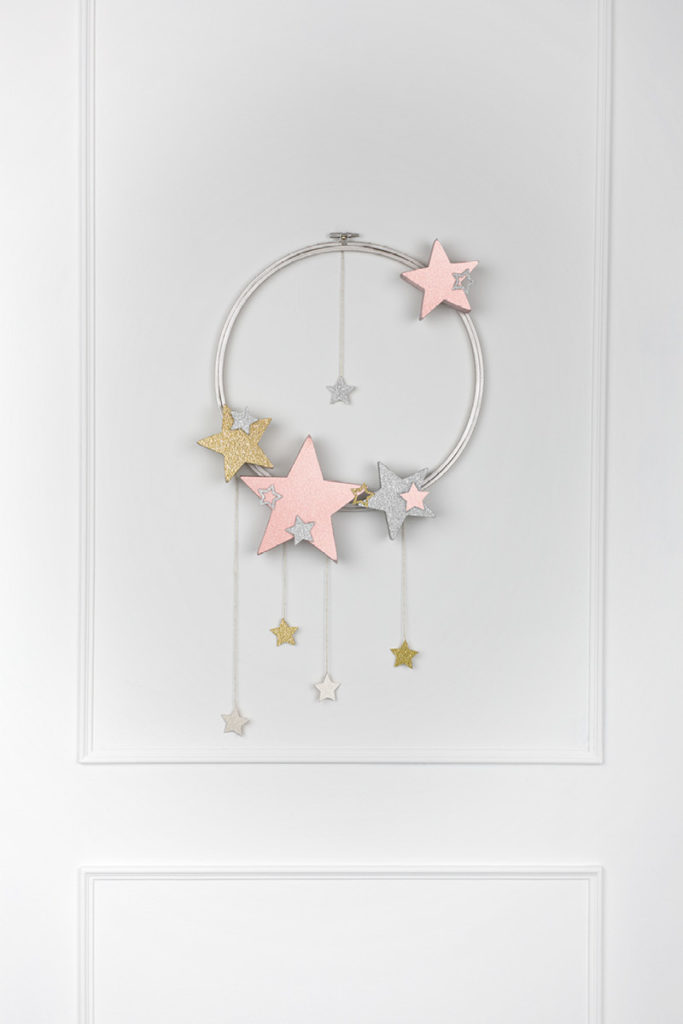 Per rallegrare l’atmosfera della casa donandole uno spirito natalizio si può ricorrere a ghirlande fatte in casa: per esempio la ghirlanda decorata con stelle. Realizzarla è semplicissimo, bastano un cerchio da ricamo, delle stelle in legno e le vernici spray di Rust-Oleum. Basta verniciare il cerchio da ricamo con la con la vernice Spray metallico oro, e le stelle con Spray rose gold e lo Spray glitter super scintillante. A questo punto bisogna assemblare tutto con la colla a caldo. Infine gli smalti satinati di MaxMeyer sono utili per aggiungere un tocco di colore. Il risultato sarà una ghirlanda scintillante, elegante e super originale.