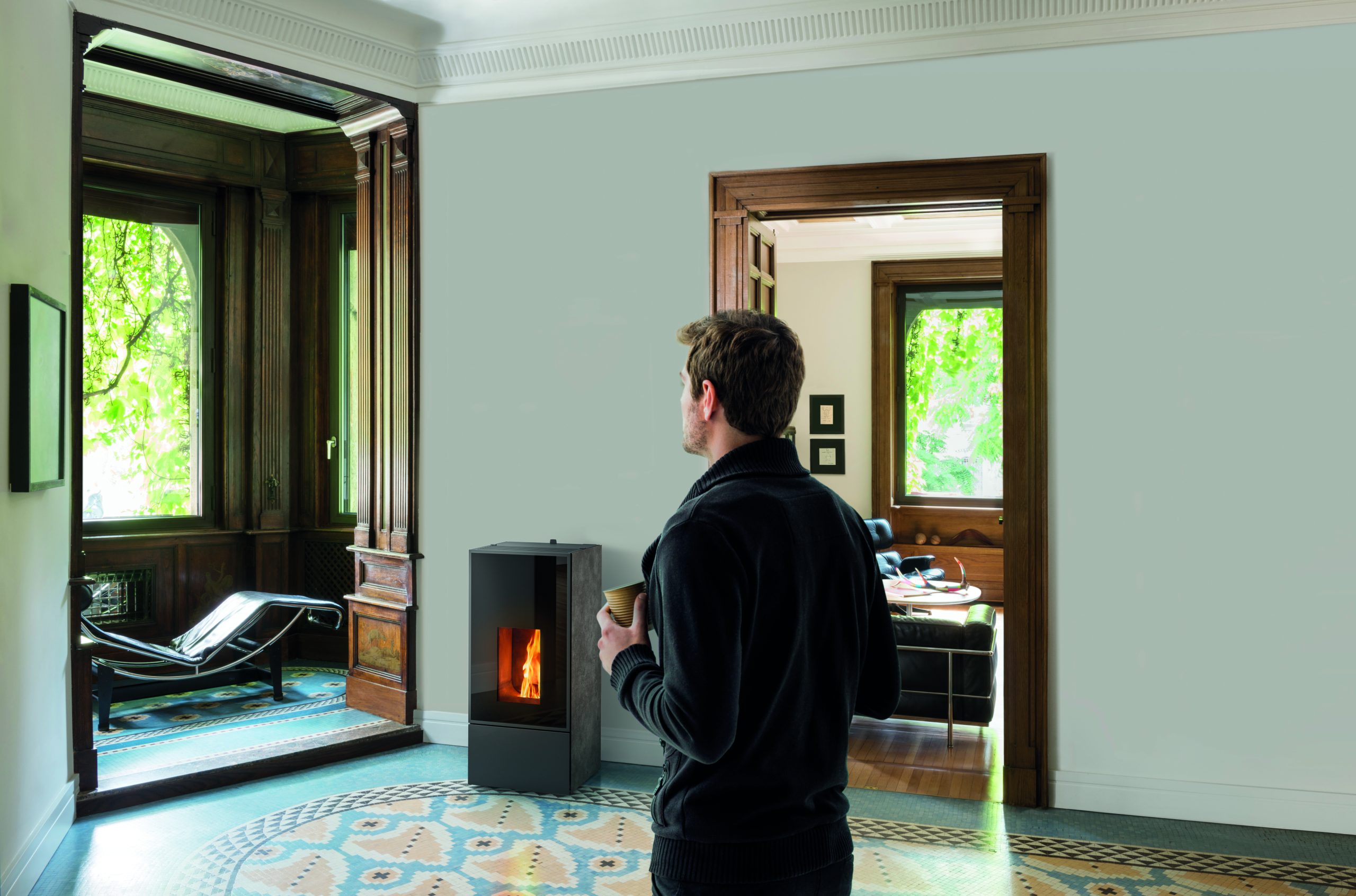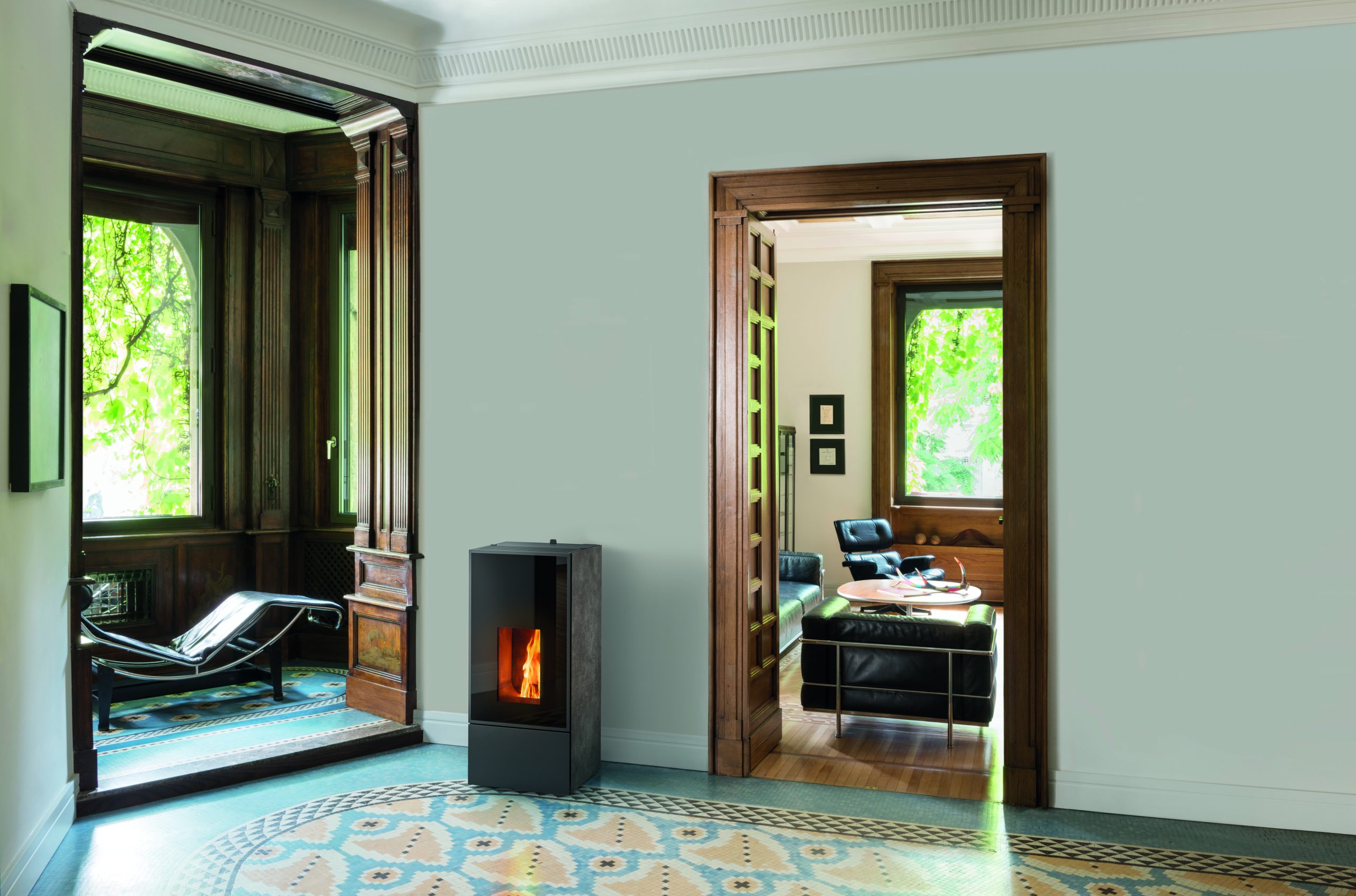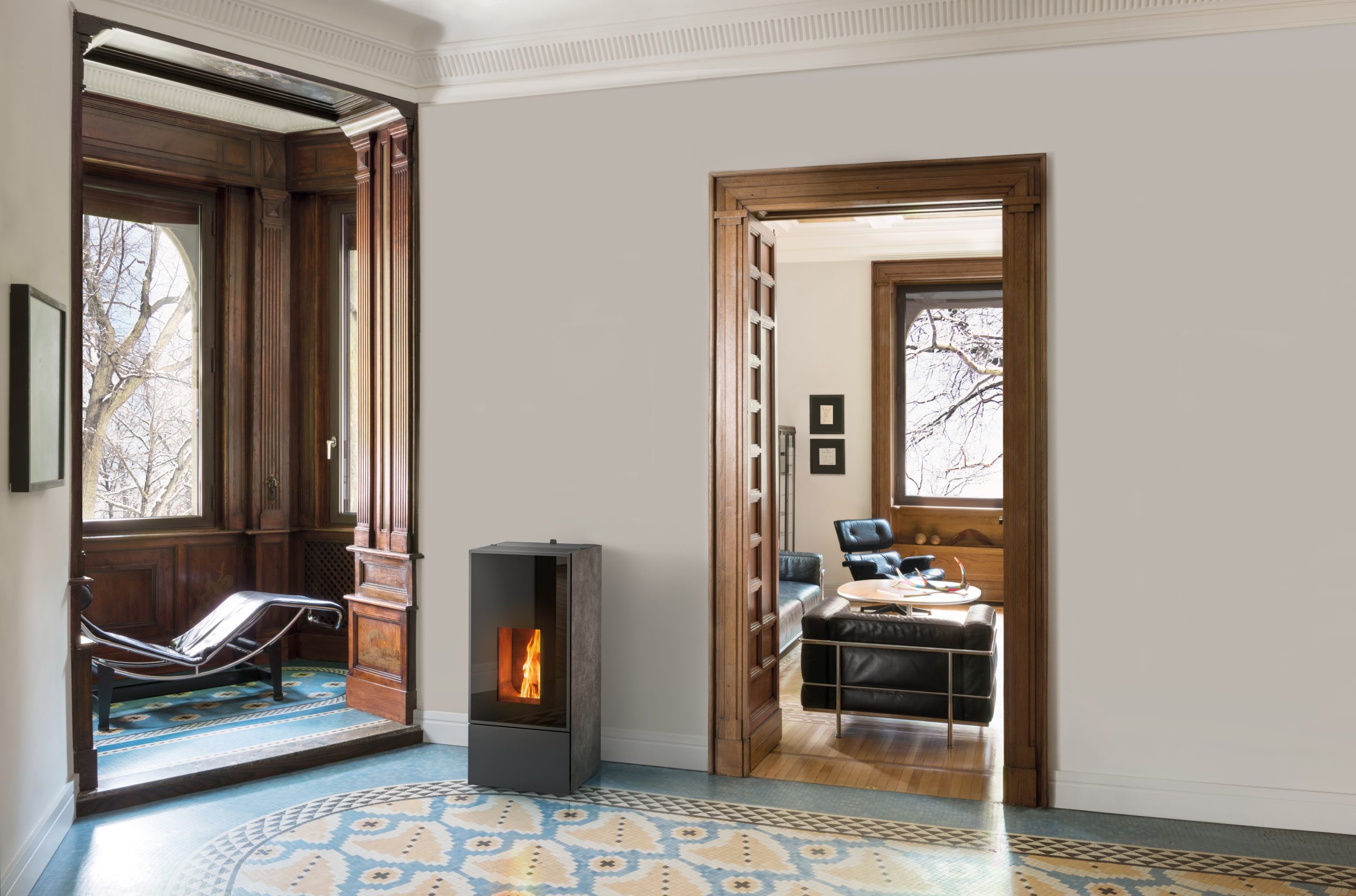Eiko di Mcz è una stufa a pellet a convezione naturale, perfetta per gli ambienti di dimensioni ridotte grazie al suo design compatto e alla possibilità di installazione ravvicinata al muro.