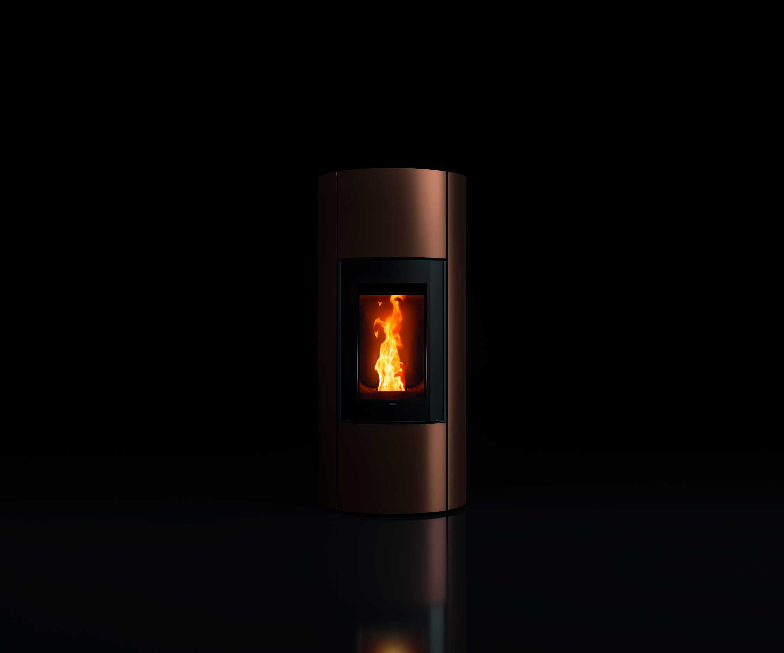 Il braciere autopulente riduce drasticamente la frequenza di svuotamento della cenere, rendendo necessario un intervento settimanale. La stufa si distingue inoltre per i materiali pregiati: porta in vetro, top in alluminio verniciato nero e fianchi in acciaio disponibili nei colori Bronze o Black.