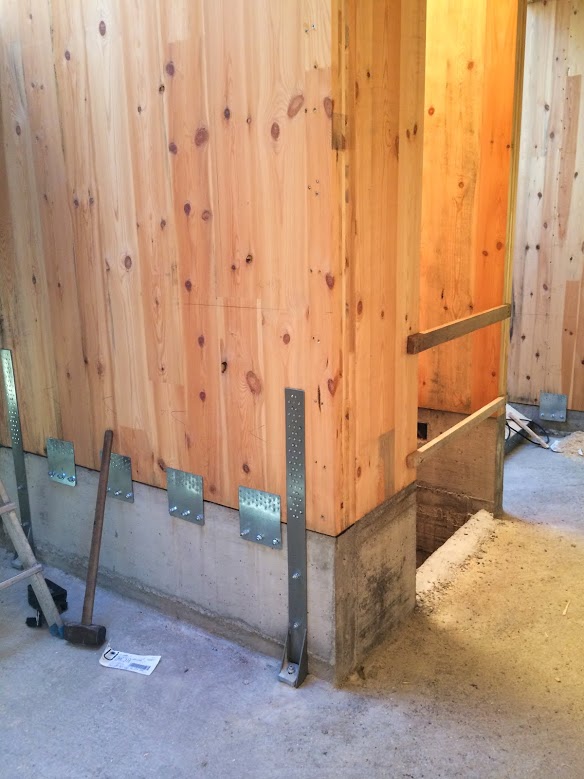 Al di sopra del piano interrato è stato realizzato un cordolo perimetrale in calcestruzzo armato di circa 20 cm di altezza, il quale permette la connessione tra la parete in X-Lam e il basamento dell’edificio tramite apposite piastre a L e viti autoperforanti.