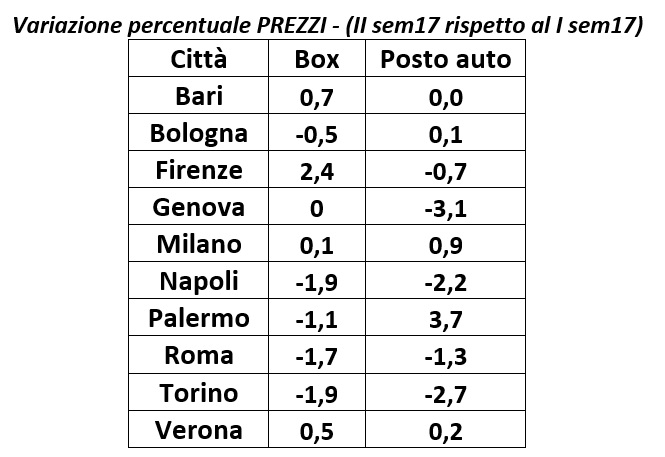 Secondo un’analisi condotta da Ufficio Studi Gruppo Tecnocasa continua anche nel secondo semestre del 2017 il calo dei prezzi dei box: nelle grandi città si è registrata una contrazione dello 0,3%. I posti auto hanno perso lo 0,5%. Continua quindi il ribasso dei valori di queste tipologie che hanno visto ridimensionarsi la domanda in seguito alla crisi immobiliare. Bari, Milano, Firenze e Verona le uniche città che registrano dei segnali positivi. I prezzi più alti riguardano sempre le zone centrali dove comunque l’offerta di box non è elevata, ci sono difficoltà di parcheggio e, spesso, immobili storici privi o con pochi box.